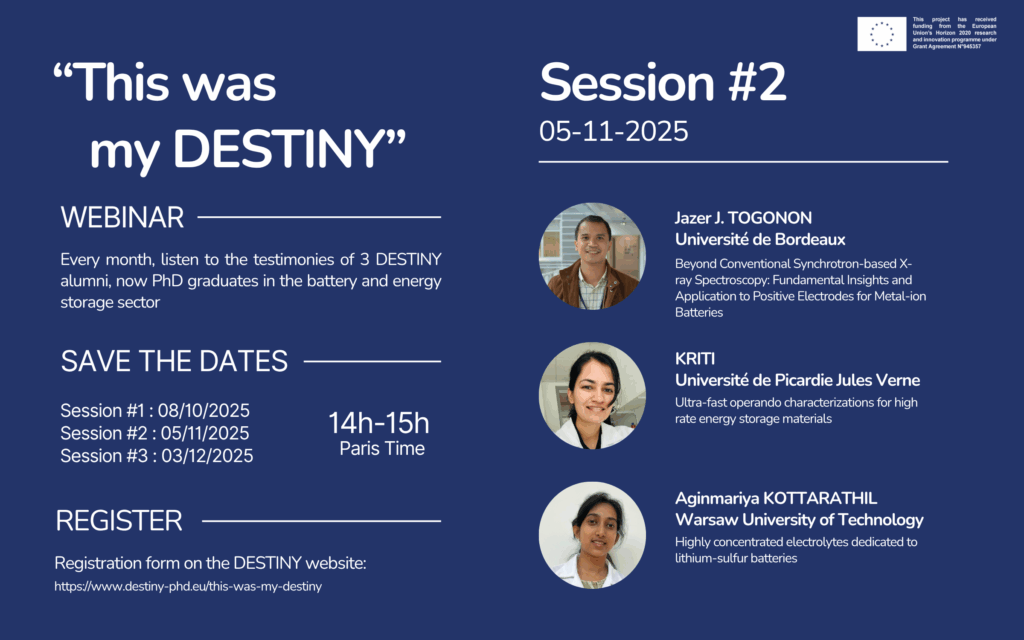 At CNRS, we have organised a series of webinars to present some highlights from the results of the MSCA COFUND doctoral programme on battery research DESTINY (2020-2026). DESTINY was conceived to be closely aligned to the research priorities identified by Battery2030+.